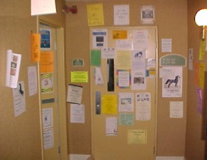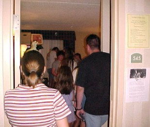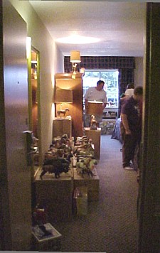 And what would Breyerfest be without a walk down the halls of the Holiday Inn North, the unofficial after Breyerfest meeting place? Reservations are made nearly a year in advance due to the popularity of this multi-halled maze. It is customary to open your room to everyone. Most people have turned their rooms into makeshift storefronts, displaying all manner of model horse related "stuff". Great deals abound! Often fliers are plastered all around the hotel advertising a sale in one room or another. Here is a junction of two hallways for example. Plastic pony people from all around pound the carpet until the wee hours bouncing from room to room to see what they can find. You just never know what will turn up. See you there again in 2002! |